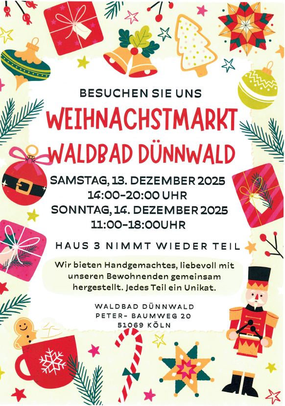 Bereits zum vierten Mal nimmt Haus 3 des Mülheimer SBK-Standortes, ein Wohnheim für jüngere neurologisch erkrankte Menschen, am wundervollen Weihnachtsmarkt im Waldbad in Dünnwald teil. „Klein aber fein und sehr persönlich“ ist hier das Motto. Wir bieten Handgemachtes, liebevoll mit unseren Bewohner*innen gemeinsam hergestellt – jedes Teil ein Unikat!